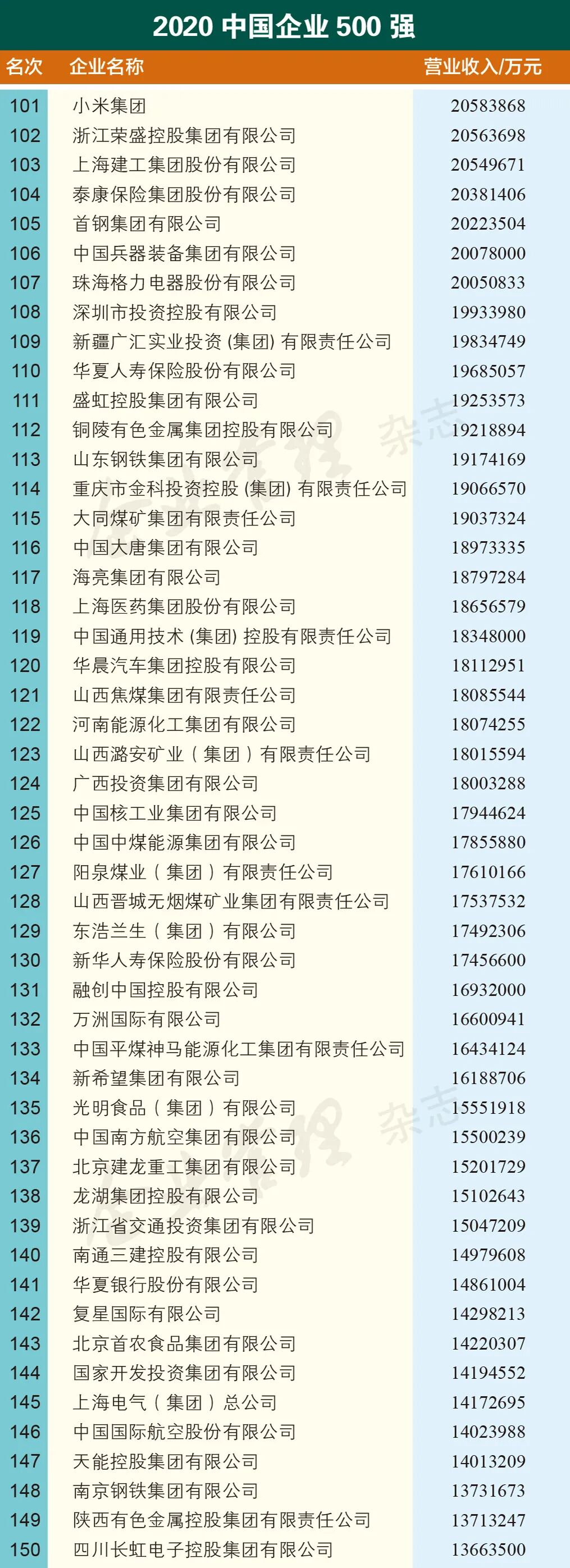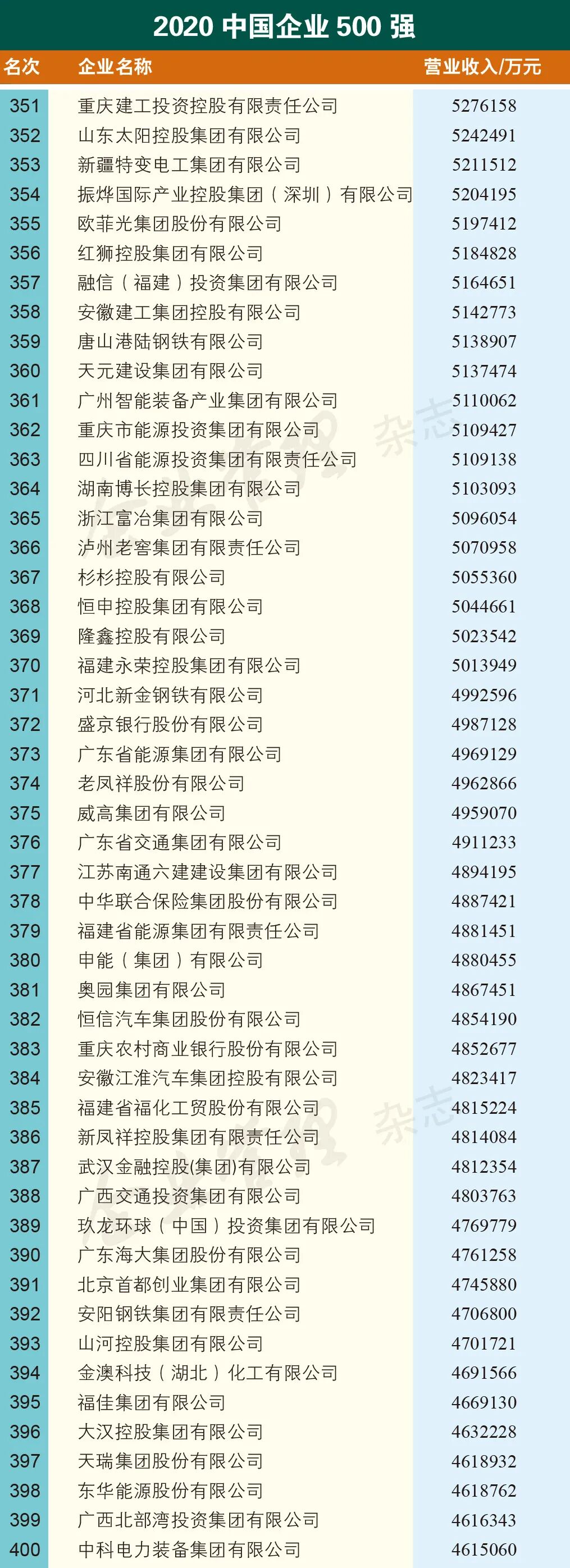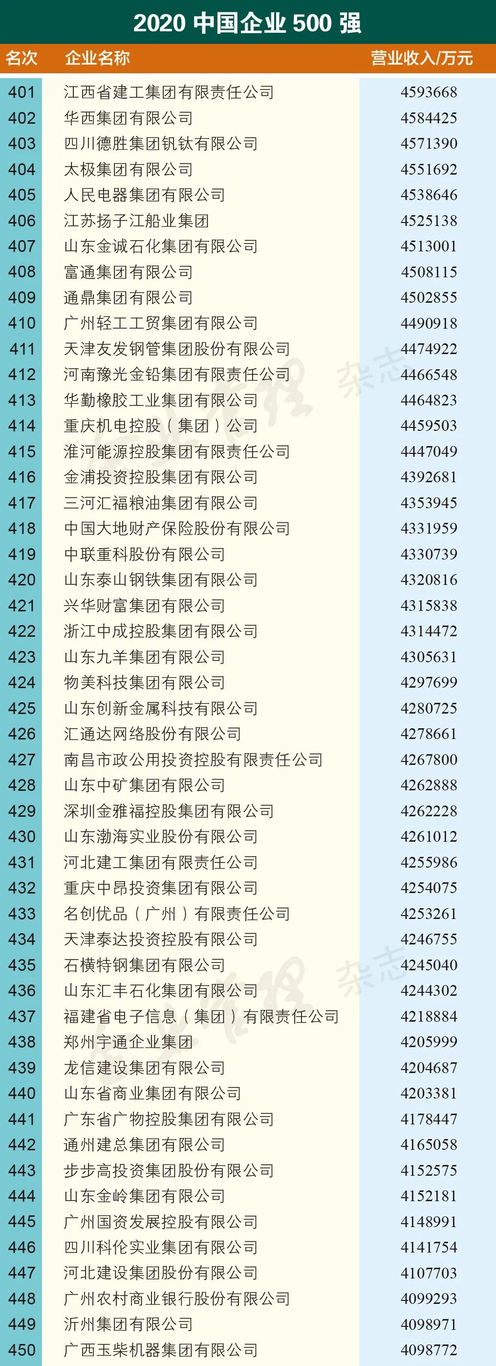 2020中国企业500强榜单由企业按照要求进行申报或采用公开数据,并经会计师事务所等单位认可,依据2019年企业营业收入排序产生,此次入围门槛为359.61亿元,与上年入围门槛相比提高了36.36亿元。中国石油化工集团有限公司以2.81万亿元营收位居榜首,国家电网有限公司、中国石油天然气集团有限公司分别以2.65万亿元、2.61万亿元营收分列第二、三名。