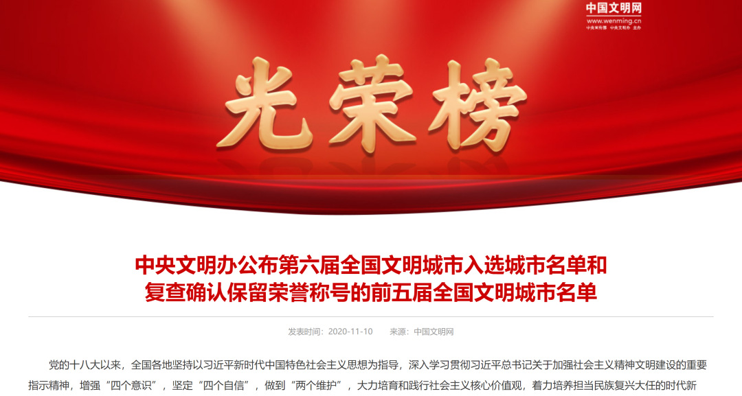 2020年8月以来,中央文明办按照城市自主申报、省级择优推荐、中央部委审核、媒体集中公示、组织综合测评、确定入选城市等评选办法和程序,严谨规范组织第六届全国文明城市评选工作,严格依据参评城市2018、2019、2020年三年测评总成绩排名,提出第六届全国文明城市入选城市名单,报中央文明委领导同志批准。同时,中央文明办按照城市自查、省级审核、中央把关、组织测评等复查办法和程序,认真做好前五届全国文明城市复查工作,严格依据全国文明城市复查测评成绩,提出继续保留荣誉称号的全国文明城市名单,报中央文明委领导同志批准。现将第六届全国文明城市入选城市名单和复查确认保留荣誉称号的前五届全国文明城市名单公布如下。