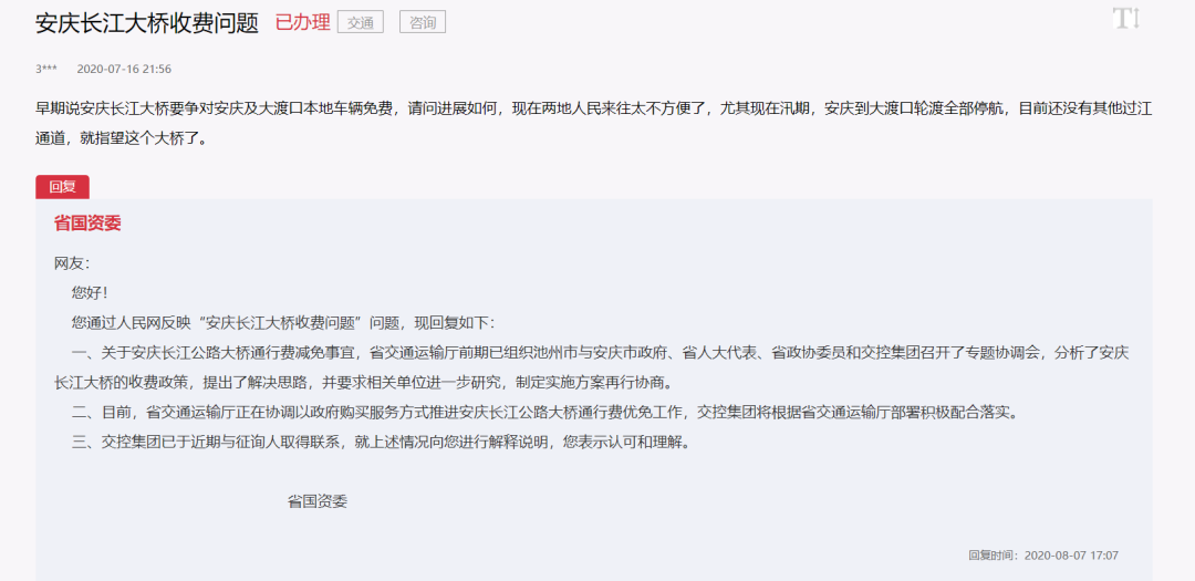 最新进展来了!近日,安徽省国资委针对大桥收费问题,给出回复:“省交通运输厅正在协调以政府购买服务方式推进安庆长江公路大桥通行费优免工作,交控集团将根据省交通运输厅部署积极配合落实。”